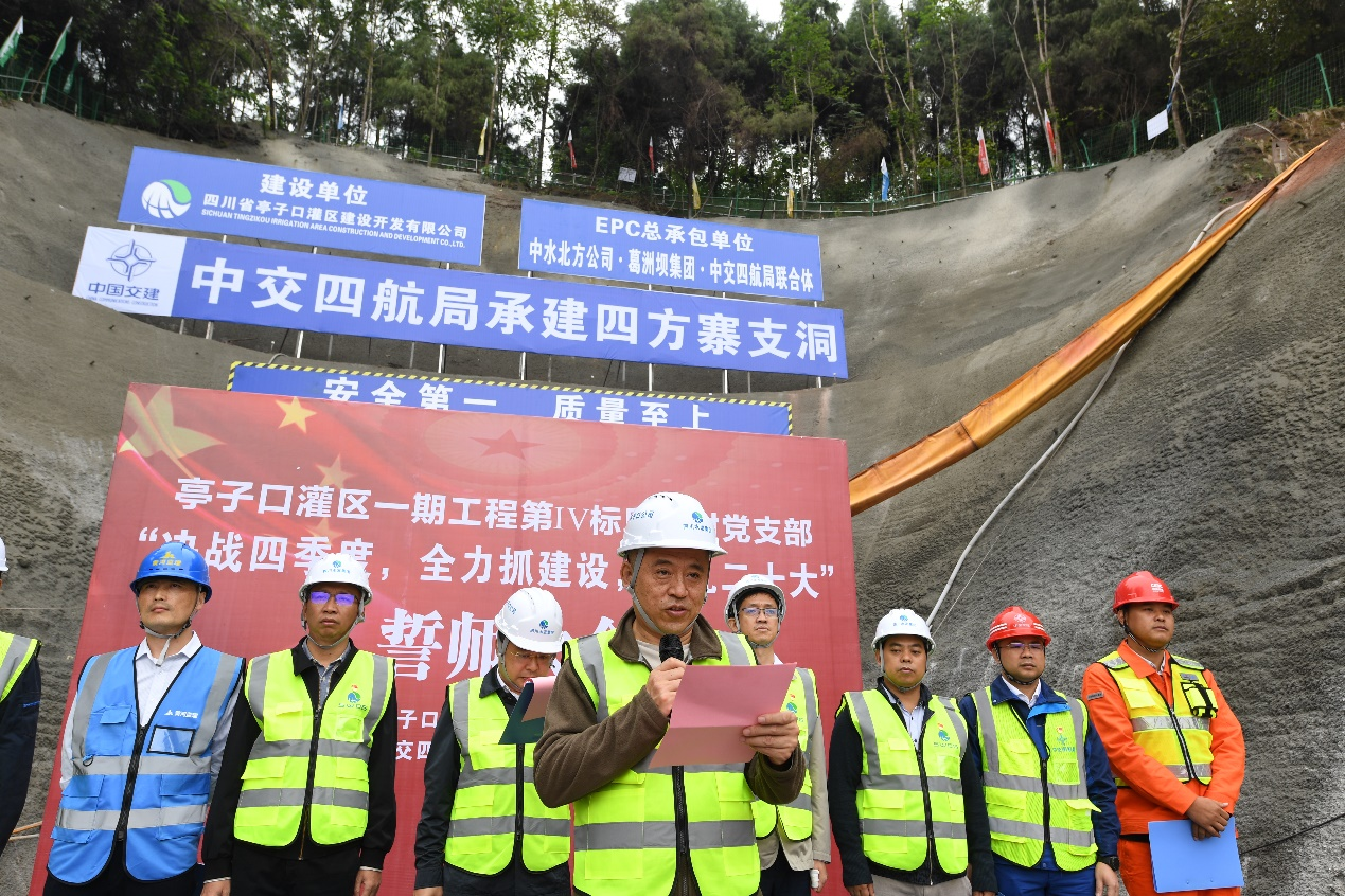 亭子口公司黨委副書記、總經理文祥明出席會議并為臨時黨支部黨員代表授予了“黨員先鋒隊”“黨員突擊隊”旗幟。他強調,本次誓師大會是對年度投資任務具體實施的再認識、再部署、再動員。亭子口灌區一期工程作為重大政治工程、民生工程,各參建單位要統一思想、加快步伐,聚焦建設、全力推進。一要堅定政治擔當。堅決響應省委省政府“拼經濟,抓建設,促發展”的戰略號召,以強有力的政治擔當全力推進工程建設,以良好的建設成績讓組織滿意、領導放心、群眾稱道。二要堅定引領擔當。臨時黨支部要主動出擊、主動作為,發動黨員時時沖在前、事事干在先,以嶄新的成績展現示范帶動、示范引領。三要堅定責任擔當。各參建單位一定要充分認清形勢,堅定必勝信心,科學組織、周密安排,規范程序、遵章守紀,迅速掀起大干快上、百花齊放的生產高潮和建設氛圍。