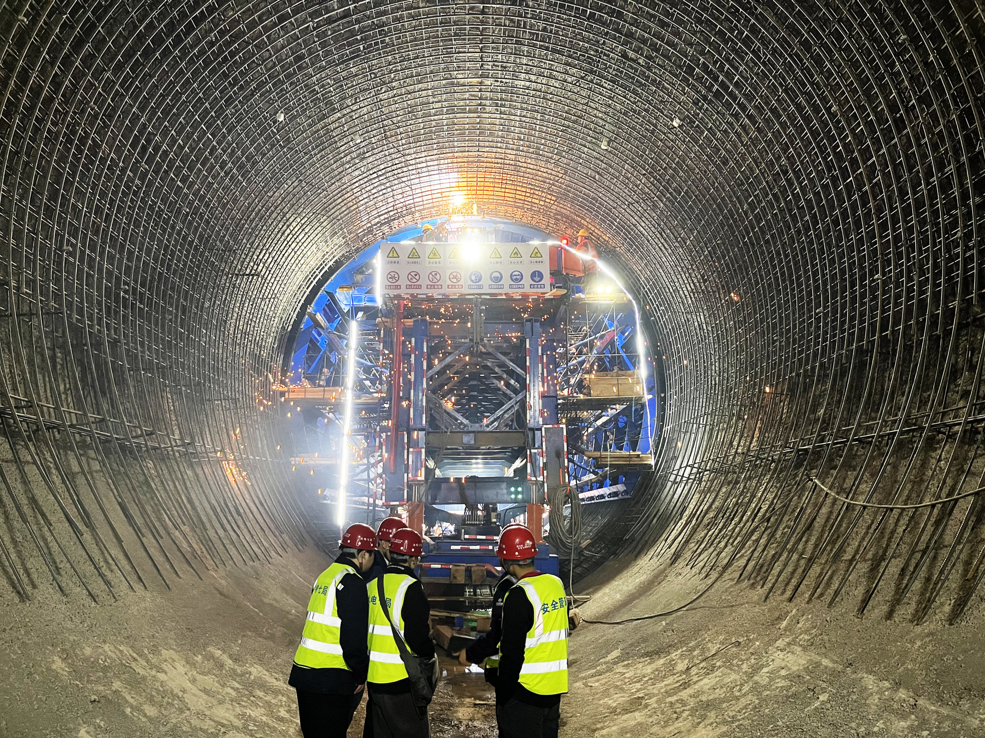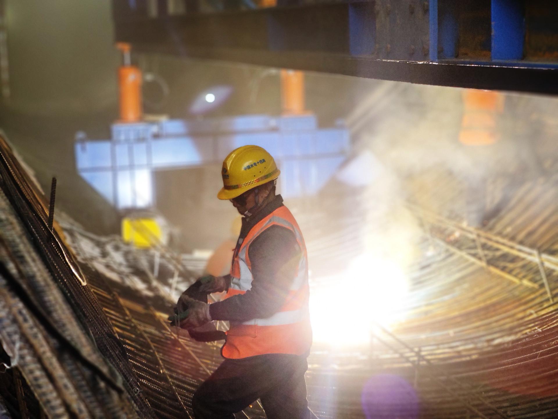 金雞梁隧洞內,工人正在焊接二襯仰拱鋼筋接頭